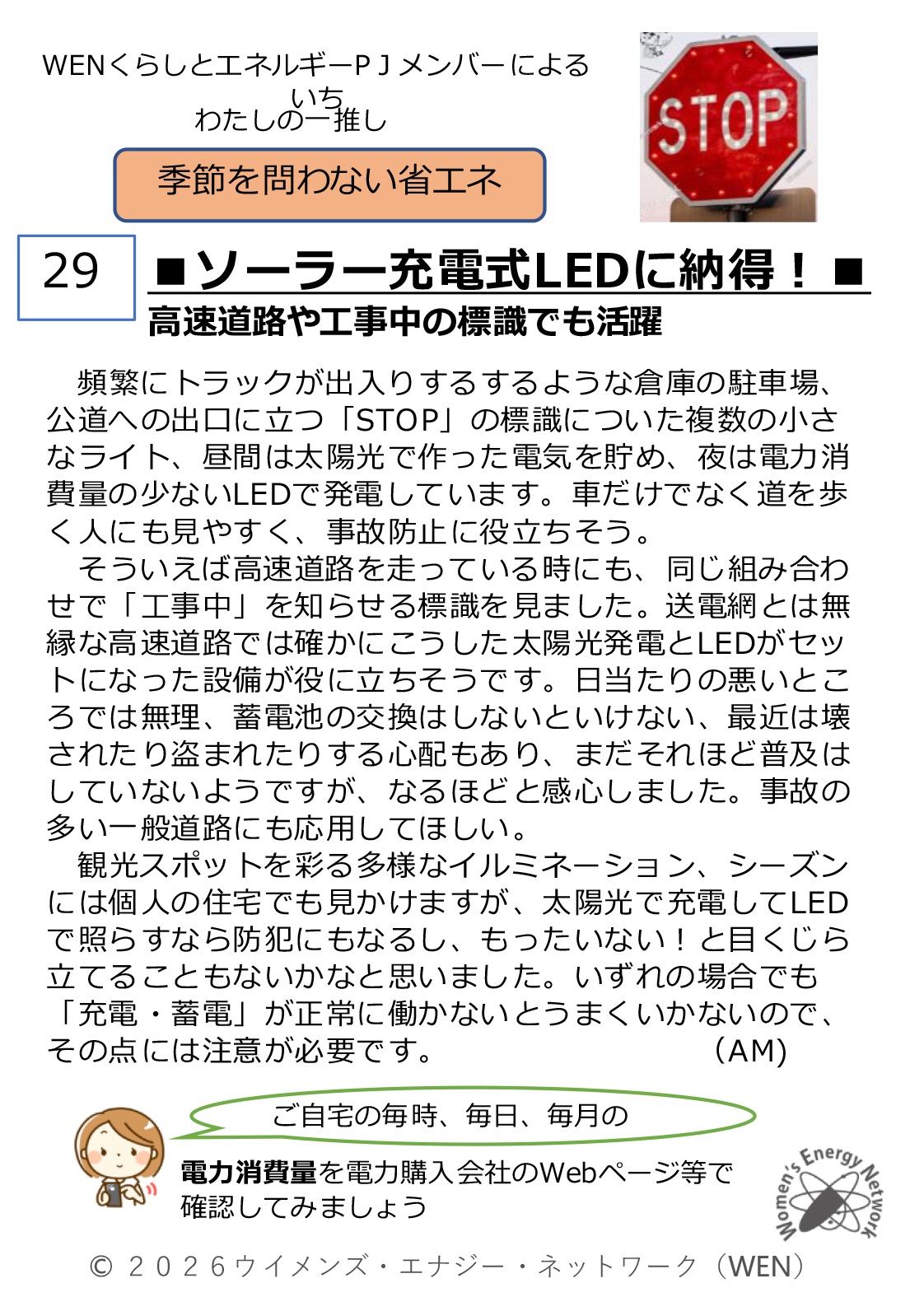 体験に基づく省エネアイデアを“小ネタ”として発信している“くらしとエネルギーPJ”。今回は日々の暮らしからちょっと目を社会に広く向け、太陽光発電とLEDの組み合わせ設備に注目。活躍目覚ましい「ソーラー充電式LEDに納得!」を発信します。 カードはダウンロード可能です。A4判1枚です。営利目的でない限りご自由に印刷・コピーして、皆様の省エネの実現にご活用いただければと思います。